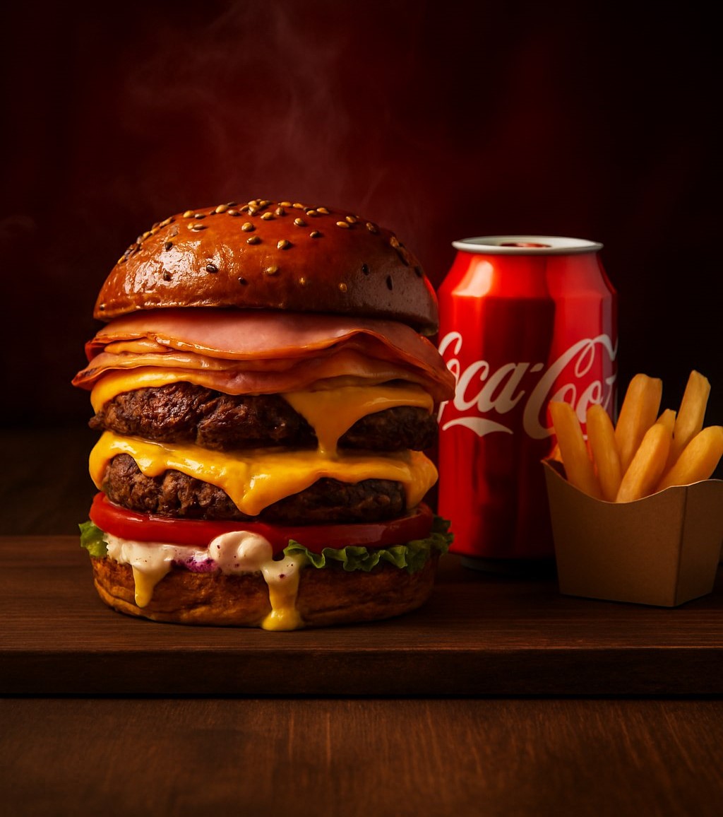 Ingredientes: 3 HambĂșrgueres Artesanais | Batata G | Coca-Cola 1L | (Ingredientes dos sanduĂches: Carne, Ovo, Molho da Casa)