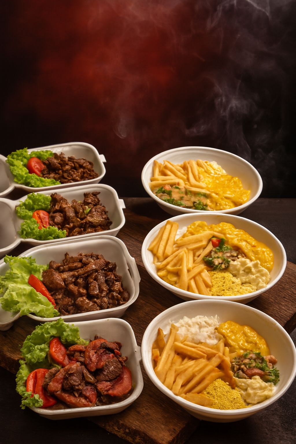 Sabores: Carne | Frango | Misto | Linguiça de Frango | GuarniçÔes: Arroz | Batata Frita | Batatonese | Farofa | Vinagrete