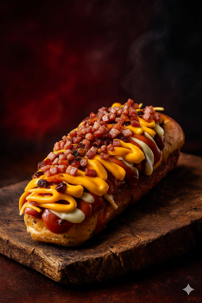 Ingredientes: PĂŁo | Molho | Salsicha | Catchup | Maionese | Queijo Ralado | Batata Palha | Creme Cheddar | Bacon