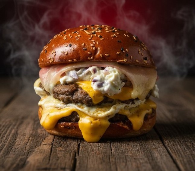 Nosso hambĂșrguer artesanal duplo com queijo mussarela, cheddar e ovo, acompanhado de batata frita mĂ©dia e Coca-Cola Lata.