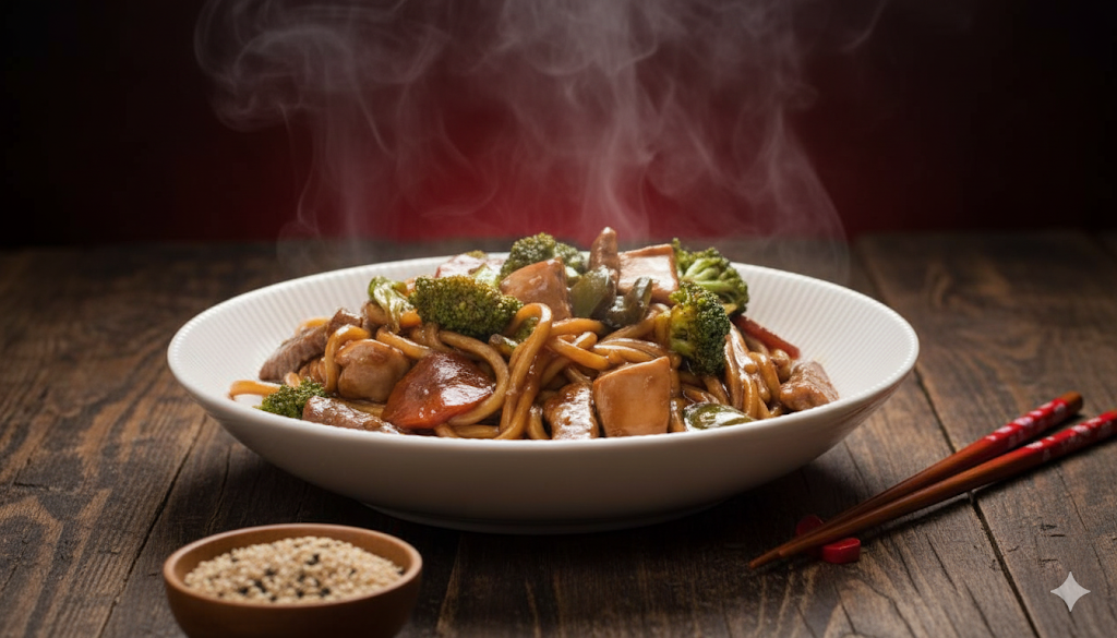 Tradicional prato oriental com macarrĂŁo, legumes e carne, preparado com molho shoyu especial.